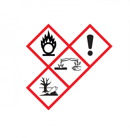 Kann Brand verstärken; Oxidationsmittel. Gesundheitsschädlich bei Verschlucken. Verursacht schwere Verätzungen der Haut und schwere Augenschäden. Sehr giftig für Wasserorganismen. Ist ärztlicher Rat erforderlich, Verpackung oder Kennzeichnungsetikett bereithalten. Darf nicht in die Hände von Kindern gelangen. Freisetzung in die Umwelt vermeiden. Schutzhandschuhe / Schutzkleidung / Augenschutz / Gesichtsschutz tragen. BEI KONTAKT MIT DEN AUGEN: Einige Minuten lang behutsam mit Wasser spülen. Vorhandene Kontaktlinsen nach Möglichkeit entfernen. Weiter spülen. Unter Verschluss aufbewahren. Inhalt/Behälter der Entsorgung als gefährlichen Abfall zuführen. Entwickelt bei Berührung mit Säure giftige Gase. Achtung! Nicht zusammen mit anderen Produkten verwenden, da gefährliche Gase (Chlor) freigesetzt werden können.