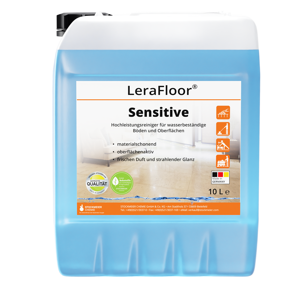LeraFloor® Sensitive ist ein Hochleistungsreiniger auf Alkoholbasis für wasserbeständige Böden und Oberflächen. Ein hohes Benetzungsvermögen und eine starke Reinigungsleistung lösen effektiv täglich anfallende Verschmutzungen jeder Art. Das Produkt ist auch optimal zum einstufigen Wischen geeignet. LeraFloor® Sensitive ist schaumarm und hinterlässt einen frischen Duft sowie strahlenden Glanz.