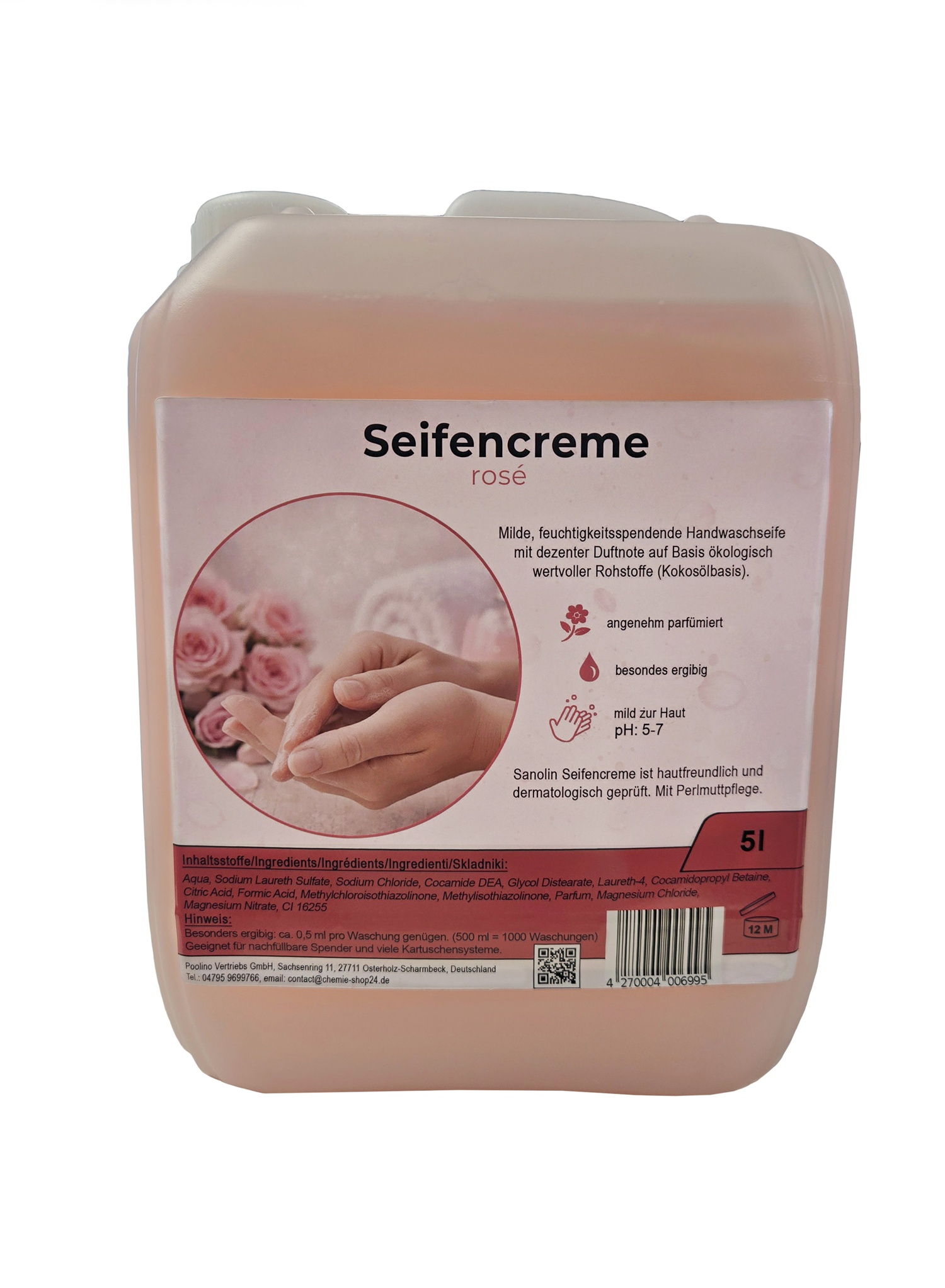 Frei von Mikroplastik. Seifencreme / Handwaschseife rose mit Perlmuttpflege in 5 Liter Kanister.
