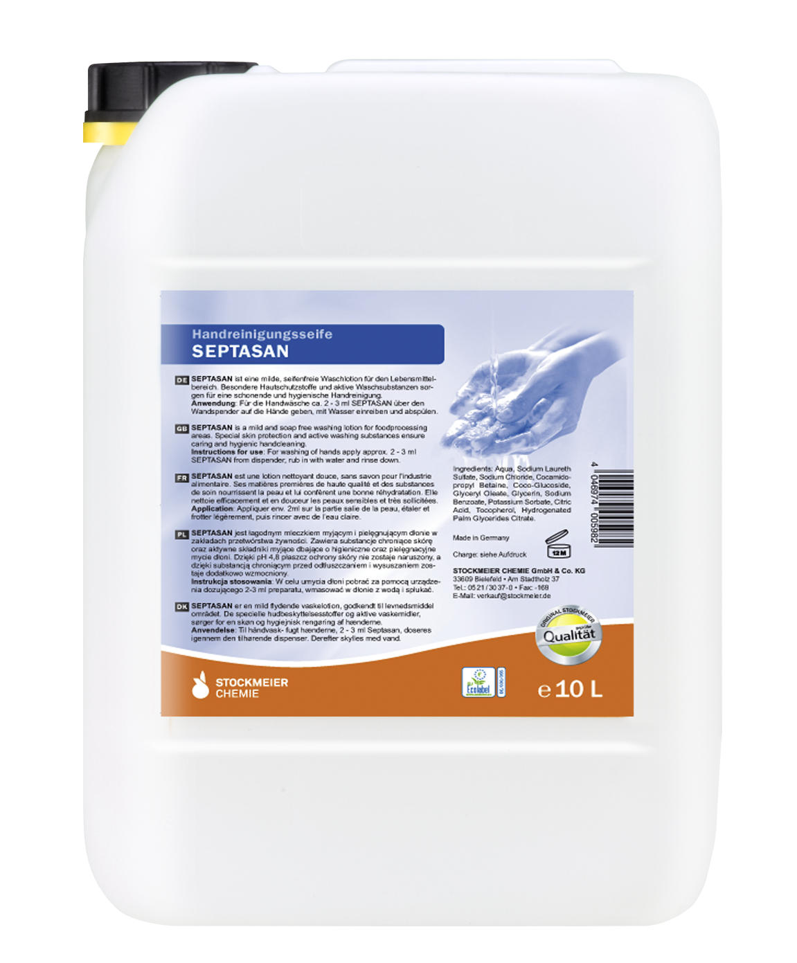 Septasan Handreinigungsseife ist eine milde Waschlotion für den Lebensmittelbereich. Besondere Hautschutzstoffe sowie aktive Waschsubstanzen sorgen für eine schonende und hygienische Handreinigung. Der Säureschutzmantel der Haut bleibt durch den hautfreundlichen pH-Wert erhalten und wird durch rückfettende Substanzen weiter stabilisiert. Das Produkt ist frei von Farb- sowie Duftstoffen. Septasan ist gelistet in der Betriebsmittelliste für die ökologische Produktion in Deutschland.